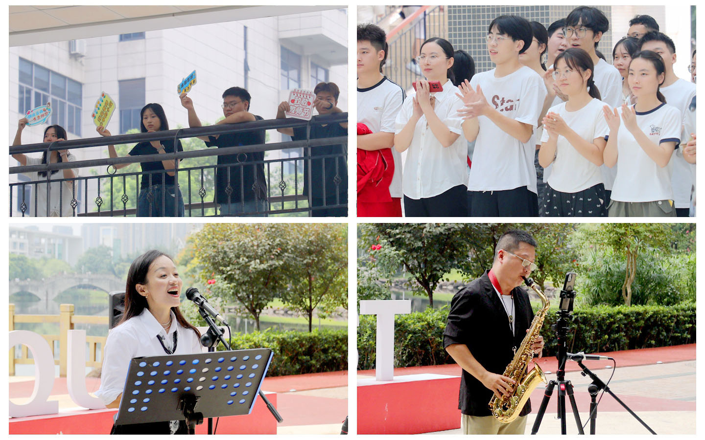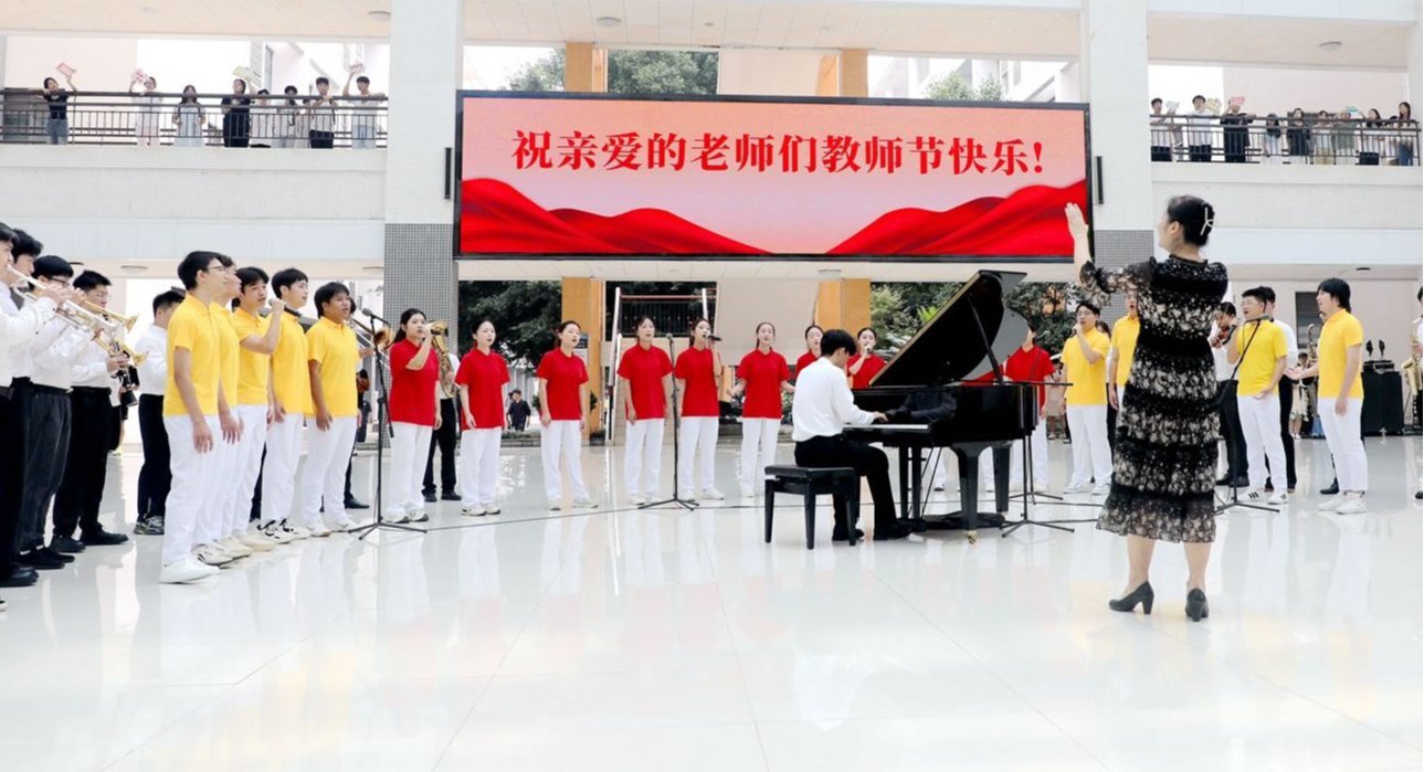 在教学主楼大厅,随着钢琴和管乐的伴奏,师生齐声高唱《我爱你中国》《爱的奉献》《我和我的祖国》,耳熟能详的歌曲深情涌动,激昂的旋律与真挚的歌声交织,汇聚成对祖国的深切热爱,对老师的真挚祝福。在环湖步道观景平台,教职工歌曲独唱和器乐演奏《老师我想你》《望春风》《慢慢飞》展现师生间的动人情谊,一曲教职工合唱《我的祖国》为此次活动画下圆满的句号。